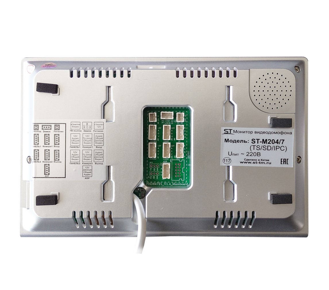 ST-M204/7 (TS/SD/IPS) СЕРЫЙ, Дисплей: 7", Разрешение: 1024*600, Поддерживаемые стандарты видео: CVBS/TVI/CVI/AHD(720Р/1080P) , Интерком: Да, Режим «не беспокоить»: Да, Запись фото/видео: Да, Слот под SD карту: Да (до 128 Гб(класс ≥ 10)), Количество мелодий звонка : 12, Автоответчик: Да(с SD карт.), Функция фоторамки: Да(с SD карт.), Возможности подключения: До 2х вызывных панелей, до 2х видеокамер, до 6и мониторов*, Напряжение питания: АС 100-240В (встроенный БП 12V), Способ монтажа : Накладной (монтажная пластина), Рабочая температура : -10°С...+60°С, Мах. коммутируемые ток и напряжение для замка (ворота): 30V/2A, Пластик, 190х121х21мм.